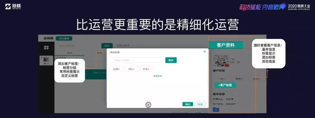 這一頁展示的是企微通打標簽和事件提醒功能:企業員工添加客戶之后,了解客戶情況與需求,為客戶創建標簽,比如今天客戶向企業員工買了一瓶香薰,三個月后系統會自動提醒員工,客戶的香薰快用完了,員工就可以給客戶發送消息:您的香薰快用完了吧,我們還有其他款也不錯,要不要試一下?同時,企業員工可以隨時查看該用戶的其他標簽,再發送適宜的話術與商品,來拉近和客戶之間的關系。