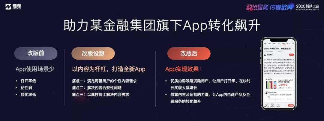 以內容云協助某大型金融集團旗下App改版為例。改版前App存在打開率低、用戶粘性弱、轉化率低等常見的問題,我們設想以內容為杠桿,來提高App的打開率和用戶粘性,滿足用戶對內容的個性化需求。改版后內容更加多樣化,而且都是來自于新媒體頭部大號,他們不僅內容優質,本身就擁有龐大的粉絲基礎。但不是所有大號的內容都適合,我們協助企業搭建的這個內容社區,是根據企業的品牌定位和目標受眾,對內容進行篩選和匹配的。企業需要面向一二線城市青年的吃喝玩樂內容,以適應App所承載的消費場景,例如在新手機發布前后,我們會策劃推送手機相關的熱點專題,在頁面中鏈接App商城中的手機商品,以內容促進購買。依靠內容和運營的力量,App內電商產品和金融服務的轉化飆升,2019年雙11當天的交易額達到2018年同期的6倍多。同時,這些私域用戶是企業可以直接觸達的,用戶的點擊、評論、轉發、閱讀時長等行為都可以被記錄,有助于企業獲取更清晰的用戶畫像。