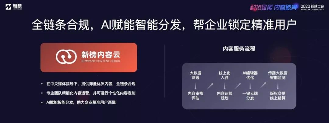 針對企業的上述痛點,新榜推出了內容云服務,以有版權的、安全的優質內容為杠桿,為企業提供精細化內容運營。內容云接受中央媒體指導,聯手多家主流內容平臺,保障導向安全;與超過1.2萬家內容創作機構一對一簽署協議,與多個圖片庫、視頻庫深度戰略合作,保障版權安全;以此為基礎,對海量優質內容進行精細化編輯和運營,全天候響應,還可以按需定制;并依托新榜的技術優勢,AI編輯器賦能創作,智能云稿庫一鍵分發,每天創作和分發的圖文、視頻內容分別超過1萬條。 為保障全鏈條的合規性,內容云把服務流程細化為8個環節,分別是:1、對優質內容的大數據篩選,2、審核評估,3、線上化入駐,4、運營規劃,5、AI編輯器優化,6、一鍵智能分發,7、傳播數據監測,以及最后的8、交易結算。