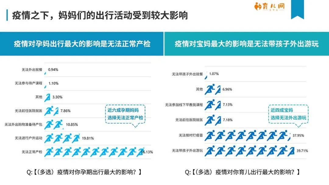 孕媽寶媽生活受影響但情緒平穩 疫情蔓延,病情進展自然是絕大多數人關心的頭條。母嬰人群雖然也不例外,不論是孕媽還是寶媽,疫情關注度均超過75%。不過作為特殊人群,她們對于自身需求的關切度尤為凸顯。 準媽媽們一方面普遍缺乏育兒經驗,而且涉及腹中胎兒的安全,所以“孕期產檢(63.52%)、胎兒發育(47.17%)”成為孕育人群最關心的話題。另外,為嚴防新冠病毒院感情況,全國多個地區的公立醫院除保留發熱門診、急診等必要科室外,其他科室暫時停診,門診部、?圃\所等也都全面停診,加上公共交通的傳染危險性較大,準媽媽又是傳染病易感染群,產檢的時間安排受到很大影響,“無法正常產檢”成為56.13%的孕媽出行方面最大的影響。 而已經育有子女的媽媽,自然最關心家庭成員的安全健康,有超過69%的媽媽關注這一問題。有網友說“2003年我害怕,因為我還是個孩子,2020年我害怕,因為我有個孩子”,生動的形容了這種狀態。而出行方面,如何和孩子在家度過一個沒有游樂場博物館旅游區的假期,成了寶媽們的煩心事。