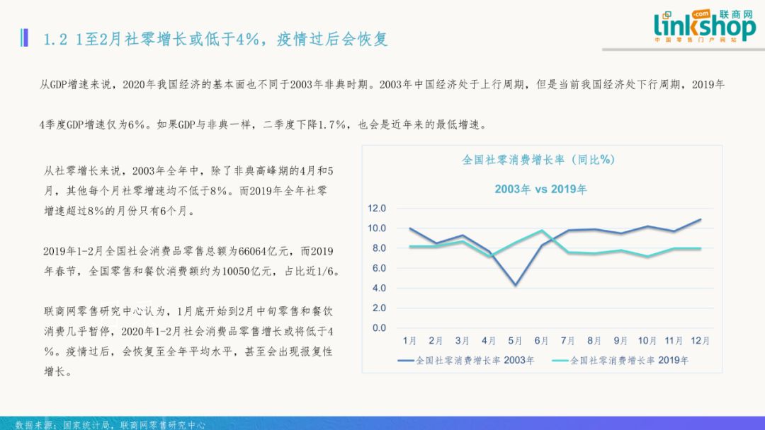 聯商網零售研究中心認為,1月底開始到2月中旬零售和餐飲消費幾乎暫停,2020年1-2月社會消費品零售增長或將低于4%。疫情過后,會恢復至全年平均水平,甚至會出現報復性消費增長。