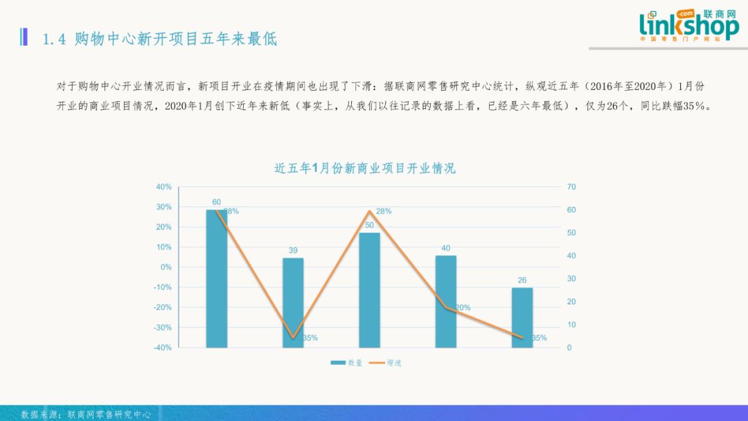 對于購物中心開業情況而言,新項目開業在疫情期間也出現了下滑?v觀近五年(2016年至2020年)1月份開業的商業項目情況,2020年1月創下了近年來新低(事實上,從我們以往記錄的數據上看,已經是六年最低),僅為26個,同比跌幅達35%。