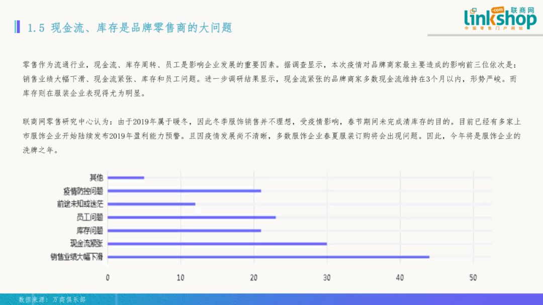 零售作為流通行業,現金流、庫存周轉、員工是影響企業發展的重要因素。據調查顯示,本次疫情對品牌商家最主要造成的影響前三位的依次是:銷售業績大幅下滑、現金流緊張、庫存和員工問題。進一步調研結果顯示,現金流緊張的品牌商家多數現金流維持在3個月以內,形勢嚴峻。而庫存則在服裝企業表現得尤為明顯。