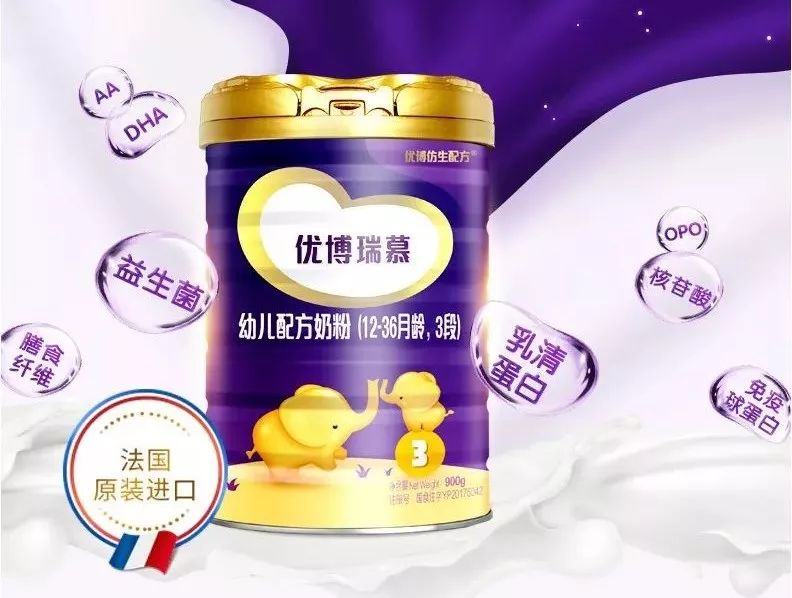 比如優博瑞慕,大面積典雅紫色在一眾淺色奶罐陳列中顯得醒目,罐體正中金色的一對大象母子嬉戲的場景,溫馨而不失活力,盡顯高端品位;