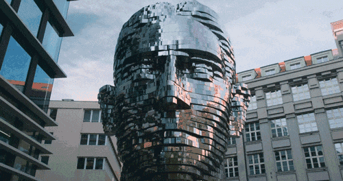 Chapter 5 一直轉圈圈的雕塑噴泉 這是一個旋轉雕塑,同時也是一個噴泉,由二十多塊獨立旋轉的不銹鋼板組成,在它轉到特定角度時,這些鋼板就能組成一個巨大的人頭像。