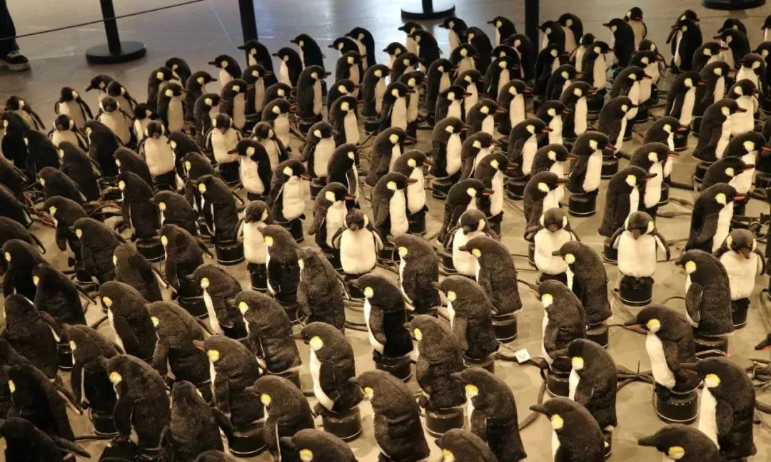 人們走進裝置,各個小鏡子會感應到人臉的位置而轉向面對人臉,跟蹤捕捉人們的臉部位置并隨著他的移動而移動。 Chapter 8 企鵝鏡 450只會旋轉的機器企鵝,通過自己的白肚皮和黑背影,完美呈現出了明暗的關系。
