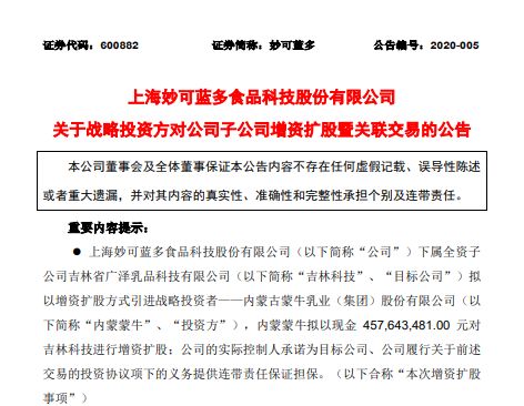2020年國內第一宗食品巨頭收購案,主角仍是去年連番買買買的蒙牛! 剛剛,在上交所上市的上海妙可藍多食品科技股份有限公司(簡稱“妙可藍多股份”)發布公告披露,蒙牛乳業集團通過約2.8億元對價獲得上市公司妙可藍多股份5%股份,通過約4.6億元對價獲得擁有上市公司幾乎全部產能資產的子公司吉林科技42.9%股份?倢r約7.4億元。