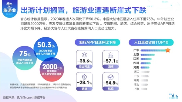 為助力品牌全面洞察疫情下消費者的行為軌跡,及時把握市場變化涌現出的全新機遇,訊飛AI營銷云正式發布《“疫”線行業圖鑒》(以下簡稱《報告》)!秷蟾妗肪劢拱舜笮袠I——旅游、金融、汽車、電商、生鮮、游戲、教育和大健康,進行重點觀察。《報告》依托訊飛跨場景一手大數據,應用訊飛大數據分析能力,解讀疫情下用戶的行為特點以及疫情后行業的發展趨勢。