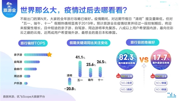 《報告》發現,疫情期間近期節假日關鍵詞“清明”的關注度同比下降20.8%,而“五一”、“端午”、“十一”等關鍵詞的關注度明顯提升,其中關鍵詞“五一”提及量同比增長41.1%!秷蟾妗奉A測,旅游業在疫情結束并經過一段控制期后,將迎來報復性增長。