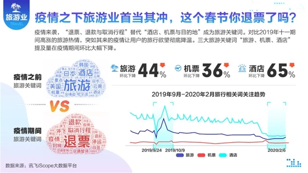 全民宅家抗“疫”,原本春節假期的出行計劃被被迫取消,旅游業遭受斷崖式下跌。“酒店、機票、目的地”等旅游關鍵詞被“退票、退款、取消行程”等替代!秷蟾妗凤@示,環比十一黃金周,“旅游”、“機票”、“酒店”這三大旅游關鍵詞的提及量均大幅下降,關鍵詞“酒店”降幅達到65%。