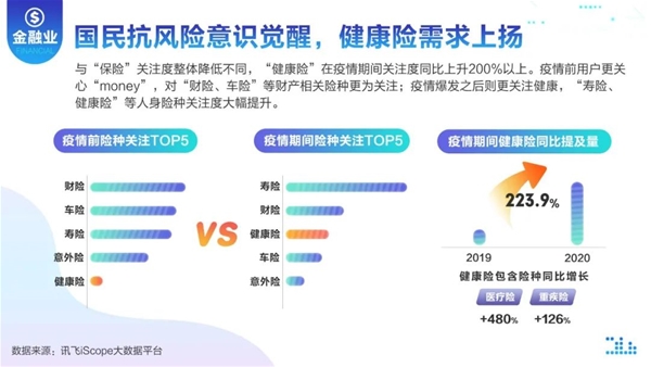 《報告》發現,與“保險”關注度呈現下降趨勢不同,“壽險”、“健康險”等人身險種的關注度大幅提升,“醫療險”關注度同比提升480%。疫情爆發,驅使國民抗風險意識覺醒,健康險需求上揚。