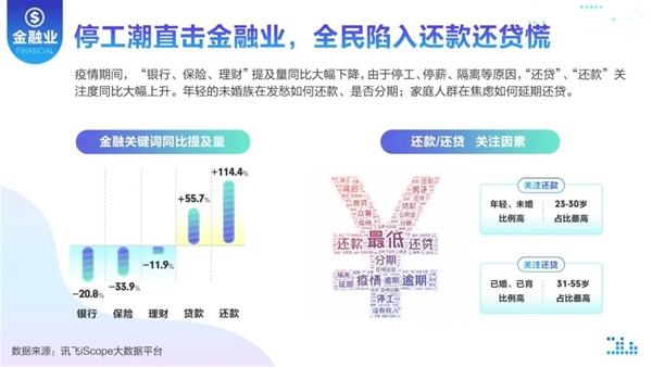 受疫情影響,企業延期復工,“降薪”、“停工”等讓貸款族壓力倍增,也讓金融行業受到沖擊!秷蟾妗钒l現,“銀行”、“保險”、“理財”的提及量同比大幅下降,而“還貸”、“還款”的關注度同比大幅上升,其中關鍵詞“還款”提及量同比上升114.4%。