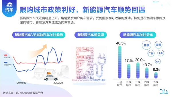 疫情激發用戶購車需求,同時,《報告》發現,疫情期用戶對新能源汽車的關注度明顯上升。在國家利好政策推動下,新能源汽車或將順勢回溫。