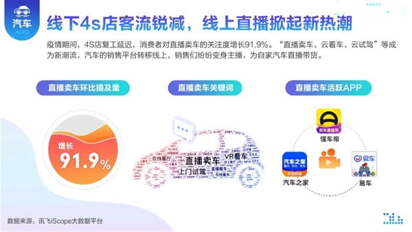 受疫情影響,4S店復工延遲,汽車銷售向線上轉移,銷售變身主播,開始直播賣車。《報告》發現疫情期間,消費者對直播賣車的關注度增長91.9%,“直播賣車”、“云看車”、“云試駕”等成為新潮流。