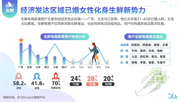 疫情期,為避免外出,“住家飯”成為必須,用戶紛紛開啟線上買菜。在此情況下,生鮮電商實現逆勢增長!秷蟾妗钒l現,疫情期間各大生鮮電商APP日活均大幅增長。廣東、北京、江蘇等經濟發達區域是新增用戶的主要來源,且大多數是31-40歲的已婚人群,女性占比略高。