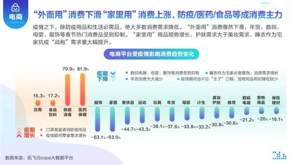 《報告》發現,用戶在電商平臺的關注點也有所變化,高關注品類由疫情前的3C、服飾、年貨,轉變為口罩、消毒液、酒精等防疫用品。年貨、數碼、母嬰、服飾等消費需求受到抑制,防疫、醫藥、食品等增長迅猛。
