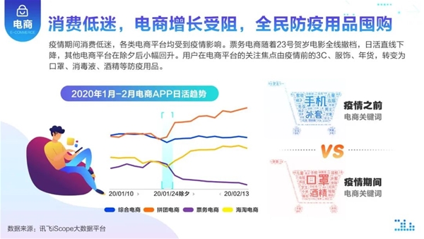 疫情期消費低迷,使得電商平臺增長受阻,綜合平臺電商、拼團電商、海淘電商、票務電商均受到疫情影響。票務電商平臺隨著23號賀歲電影全線撤檔,日活直線下降。