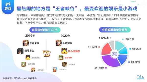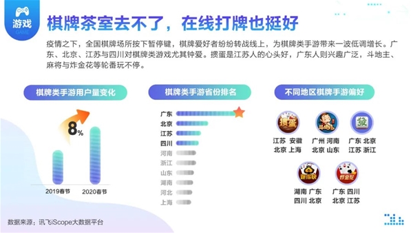 春節假期,各類線下娛樂活動因疫情中止,用戶在家時間增多,游戲成為宅家神器。各類手機游戲迎來一輪集中爆發。《報告》顯示,春節期手游提及量同比增長71.1%,用戶增長速度加快16.8%。棋牌類手游和休閑益智類小游戲也收割一波低調增長。