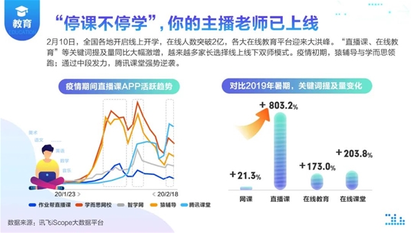 受疫情影響,學校延遲開學。在“停課不停學”的號召下,各地學校線上開學,在線上課人數超2億,各類在線教育平臺迎來大洪峰!秷蟾妗凤@示,“直播課”、“在線教育”相關詞關注度對比2019年暑假大幅度增長,其中,關鍵詞“直播課”對比2019年暑假的提及量增長超800%。