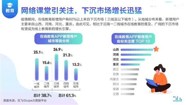 《報告》發現,疫情期間在線教育的新增用戶有60%來自于三線及以下城市。從地域分布來看,新增用戶主要集中在“山西、河南與河北”等省份。《報告》預測,在線教育在下沉市場的發展有望迎來新機遇。