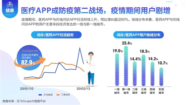 防疫期間,醫療APP成第二戰場!秷蟾妗凤@示,疫情期間醫藥APP、在線問診APP日活持續上升,同比增長80%以上。使用醫藥和問診APP的用戶主要集中在一線和新一線城市。