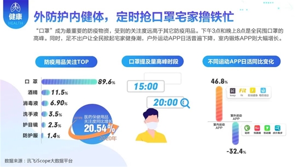 防護物品中,“口罩”的關注程度最高,下午3點和晚上8點是用戶囤貨高峰。除了注重體外防護外,全民開始了宅家健身潮!秷蟾妗凤@示,疫情期間室內運動APP日活上升46.8%,戶外運動APP日活下降32.4%。