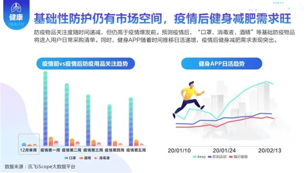 《報告》發現,用戶對防疫物品的關注度隨時間遞減,但仍遠高于疫情爆發前,基礎性防護仍有市場空間,同時健身APP的日活呈現遞增趨勢,用戶對疫情后健身減肥的需求強烈。