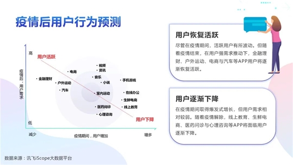 在用戶行為方面,《報告》預測,疫情期用戶使用量明顯增加的線上教育、生鮮電商、醫藥問診等APP在疫情結束后將面臨一波用戶流失。在強需求推動下,金融理財、戶外運動、電商、汽車等APP將迎來用戶回歸。
