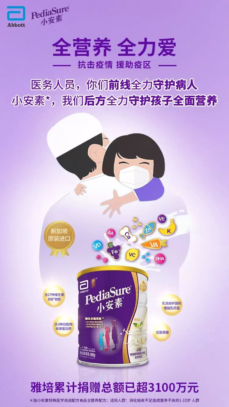 在抗擊疫情的愛心隊伍中,外資企業的物資捐贈對于中國打贏這場狙擊戰起到重要作用。雅培宣布,即日起追加捐贈價值超1300萬元的兒童營養品和醫學營養品,持續關愛奮戰在一線的醫護人員及其子女,和受疫情影響的兒童。至此,雅培捐贈總額累積已超過3100萬元。 在抗擊新型冠狀病毒的關鍵階段,雅培不僅為母嬰人群提供全面的科學營養支持,還開展了一系列特殊關愛和服務,專項保障母嬰人群,和她們一起共克時堅,守護健康。 雅培營養品業務北亞區副總裁嘉雷諾表示:“我們密切關注疫情發展,也深知當下中國孕媽、寶媽和新生兒面臨的多方面挑戰。在這個特殊時期,我們希望能一日既往為中國媽媽提供優質的科學營養解決方案,盡可能幫助她們解決當下遇到的實際問題。因此,我們迅速協調各方資源,盡一切努力為孕產婦提供幫助和支持,全力守護寶寶們健康成長。同時,通過此次追加捐贈,雅培希望為前線醫護人員及他們的家人帶去科學、優質和專業的全方位營養支持,幫助醫護人員以更佳的健康狀態救助患者、全力抗擊病毒。” 營養全面的雅培小安素,守護兒童健康 在抗擊新型冠狀病毒的關鍵階段,雅培為奮戰在一線的醫護人員及其子女,和受疫情影響的兒童帶來特別關愛。在此次捐贈中,雅培專門為全國一線重點醫院的醫務人員子女,以及感染疫情的兒童病患捐贈了全營養配方產品小安素作為營養支持。小安素[1]含3種動植物來源蛋白質,以及27種維生素和礦物質,補充全面營養,助力健康成長。當醫護人員在前線奮戰守護病患之際,雅培希望能在后方幫助他們關愛和守護孩子的全面營養,保障孩子在特殊時期的營養。 2月2日,國家衛健委婦幼健康司發布了《關于做好兒童和孕產婦新型冠狀病毒感染的肺炎疫情防控工作的通知》,通知里強調:兒童和孕產婦是新型冠狀病毒感染肺炎的易感人群,需要做好居家兒童疫情防控工作。從疫情的發展可以看出,病毒侵襲沒有年齡選擇傾向,早期兒童患者少的主要原因可能是接觸機會少,隨著總確診患者數不斷增多,加之低年齡段人群防護不足,導致嬰幼兒患者開始出現。為了減少兒童感染風險,除了加強隔離防護等,加強營養也是重要的措施之一。 《中國學齡前兒童膳食指南(2016)》也指出:學齡前兒童的合理營養應由多種食物構成的平衡膳食來提供,規律就餐是其獲得全面、足量的食物攝入和良好消化吸收的保障。指南還指出:我國兒童鈣攝入量普遍偏低,對于快速生長發育的兒童,應鼓勵多飲奶,建議每天飲奶300-400ml或相當量的奶制品。在比拼抵抗力的特殊時期,雖然出門買菜壓力重重,但更要注意孩子的全面營養,可以增加蛋白質的攝入,而奶制品是最容易獲得的營養全面的、含有優質蛋白質的食品,同時要合理補充維生素等營養物質。因此,打好兒童防“疫”戰,營養全面是關鍵。