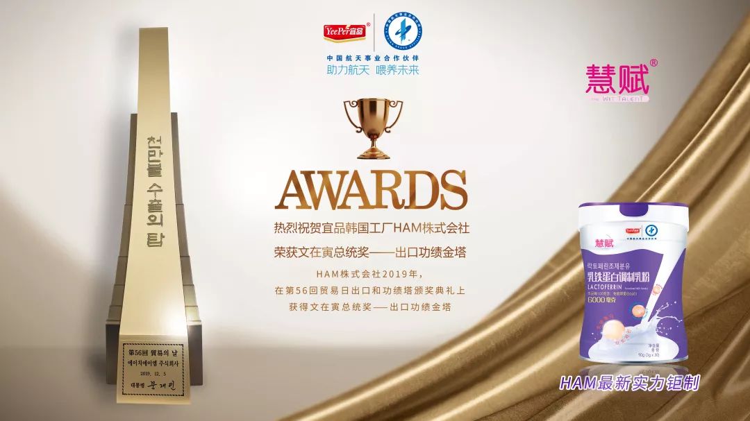 宜品慧賦乳鐵蛋白調制乳粉在本月正式亮相市場,遠在韓國的生產工廠宜品HAMGLOBAL同時傳來了喜訊,為慧賦乳鐵蛋白的熱賣助力。 韓國總統金獎 2019年12月9日,在大韓民國全羅南道木浦市,由韓國全羅南道與韓國貿易協會聯合舉辦的第56回貿易日出口和功績塔頒獎典禮中,宜品HAM GLOBAL工廠斬獲韓國總統獎金獎,這也是宜品HAM GLOBAL第二次獲得總統獎。
