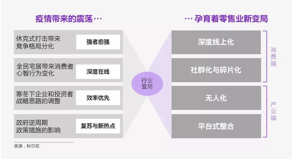 凱度咨詢在近日發布的《疫情之下,各行各業的危與機(二)——零售篇》文中指出,此次疫情對零售行業造成了直接沖擊,但便利店、無人店與自動販賣機等實體零售,各類電商,以及線上與線下的整合零售都出現了新的機遇。 以百貨與購物中心為例,凱度咨詢認為:短期來看,由于疫情導致的客流減少會在不同程度上對實體百貨和購物中心的生意產生影響。而就長期而言,這可能是這些企業加快數字化轉型、加強線上推廣和新工具應用、加快融合線上線下、充分挖掘會員數據的最佳契機。 線上商城、官方微信賬號、微信小程序等百貨或者購物中心自有線上平臺的重要性在今年將得到凸顯。 會員關系管理、數據深度挖掘、個性化產品以及促銷定制、實現高價值高質量的會員和銷售增長將會成為核心策略。 體驗式消費依舊是線下消費的主旋律,不過,如何利用新技術打造沉浸式線上購物體驗也是值得探討的一個話題。 凱度咨詢指出,從短期來看,部分渠道與業態的消費需求提升明顯;就長期而言,這次挑戰對培養新的消費習慣、開啟新的藍海、促進商業轉型與升級將起到重要的推動作用。 -05- 科爾尼(A.T. Kearney) 而管理咨詢公司科爾尼公司發布《海嘯之后,暗潮洶涌——疫情之后的零售業變局》中指出,零售行業是疫情打擊的重災區,對各業態、各品類的影響不盡相同?傮w來說,有三大影響: 第一,線上影響弱于線下,生鮮電商變“危”為“機”。預計疫情之后,電商占社會消費品零售總額有望從當前21%進一步提升至24%或更高。 第二,近場受創小于遠場。當前,對于貼近社區的超市、便利店、社區生鮮店等“近場業態”來說,生鮮和生活必需品的核心需求依然強勁,負面影響主要來自一部分政策性閉店要求和防疫措施帶來的成本上升;而“遠場業態”如購物中心、百貨、品類專業店、餐飲則普遍“休克”,現金流危機嚴重。 第三,大平臺韌性強于小平臺。在面對疫情的反應速度、調度能力、運營彈性上,大平臺顯示出了更強的優勢。由細微見大勢,疫情之后,行業洗牌會更加猛烈。
