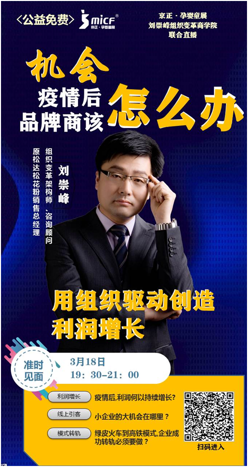 京正·孕嬰童展直播第一講即將開啟~中國嬰童招商網協辦支持 時間:3月18日(周三)19:30 【直播主題】 《疫情彎道超車的新風口,用組織驅動創造利潤增長》 【直播導師】 劉崇峰 組織變革架構師、咨詢顧問 原松達松花粉銷售總經理 【話題核心】 1、組織能力跟不上市場的發展是制約企業發展最大的瓶頸,疫情一定會過去,如何提升組織能力,創造利潤的持續增長將要永遠面對。 2、裸價供貨的商品,為什么銷量都很一般? 3、商品低價促銷能成為品牌商的核心競爭力嗎? 4、銷量巨大的著名品牌,產品好是唯一的因素嗎? 5、產品以外利潤的增長點在哪里? 6、簡單的承包制與員工持股為什么很難成功? 7、如何構建一線員工賣力,后臺員工努力的經營模式? 8、由商品增長轉向組織驅動的利潤增長路徑在哪里? 9、如何將省辦(綠皮火車)孵化為合伙人制的分公司(高鐵模式) 10、綠皮火車與高鐵的模式,企業成功轉軌的必要條件是什么? 11、小企業的大機會在哪里?如何構建以點帶面的核心競爭優勢?