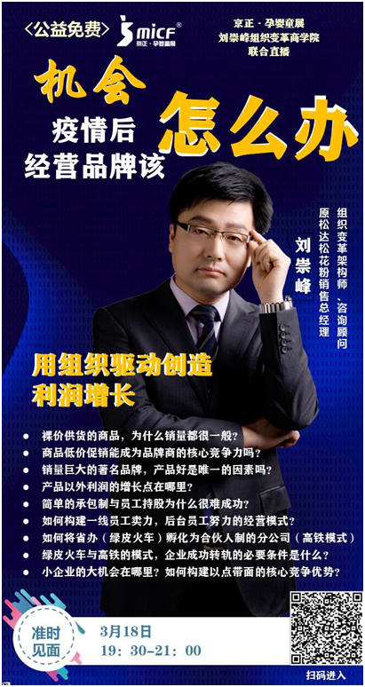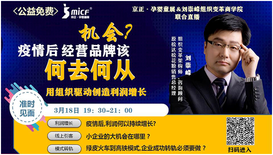 京正·孕嬰童展直播第一講即將開啟~中國嬰童招商網協辦 時間:3月18日(周三)19:30 【直播主題】 《疫情彎道超車的新風口,用組織驅動創造利潤增長》 【直播導師】 劉崇峰 組織變革架構師、咨詢顧問 原松達松花粉銷售總經理 【核心話題】 •疫情后,利潤何以持續增長? •小企業的大機會在哪里? •綠皮火車到高鐵模式,企業成功轉軌必須要做?