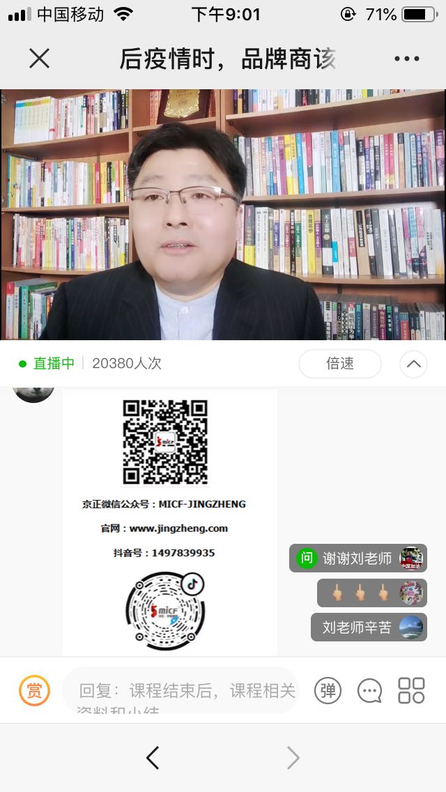 隨后,組織變革架構師劉崇峰老師開始了一個多小時的直播演講,演講內容精彩紛呈,主要講到了: 1、組織能力跟不上市場的發展是制約企業發展最大的瓶頸。 2、裸價供貨商品,為什么銷量都很一般。 3、商品低價促銷能成為品牌商的核心競爭力嗎? 4、銷量巨大的著名品牌,產品好是唯一的因素嗎? 5、產品以外利潤的增長點在哪里。 6、簡單的承包制與員工持股為什么很難成功。 7、如何構建一線員工賣力,后臺員工努力的經營模式。 8、由商品增長轉向組織驅動的利潤增長路徑在哪里。 9、如何將省辦孵化為合伙人制的分公司。