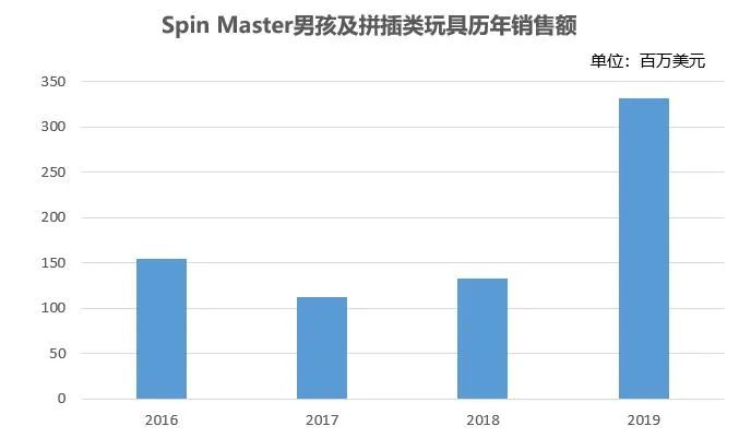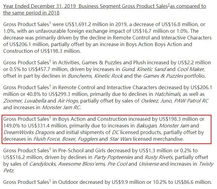 加拿大玩具公司Spin Master3月初公布了2019年財報,全年營收15.8億美元,同比下降2.1%,但是男孩及拼插類(Boys action and construction)玩具的銷售額達3.3億美元,同比增長149%。財報指出,這主要受其自有IP爆丸及授權合作IP怪獸大腳車和馴龍高手相關玩具的銷量帶動。