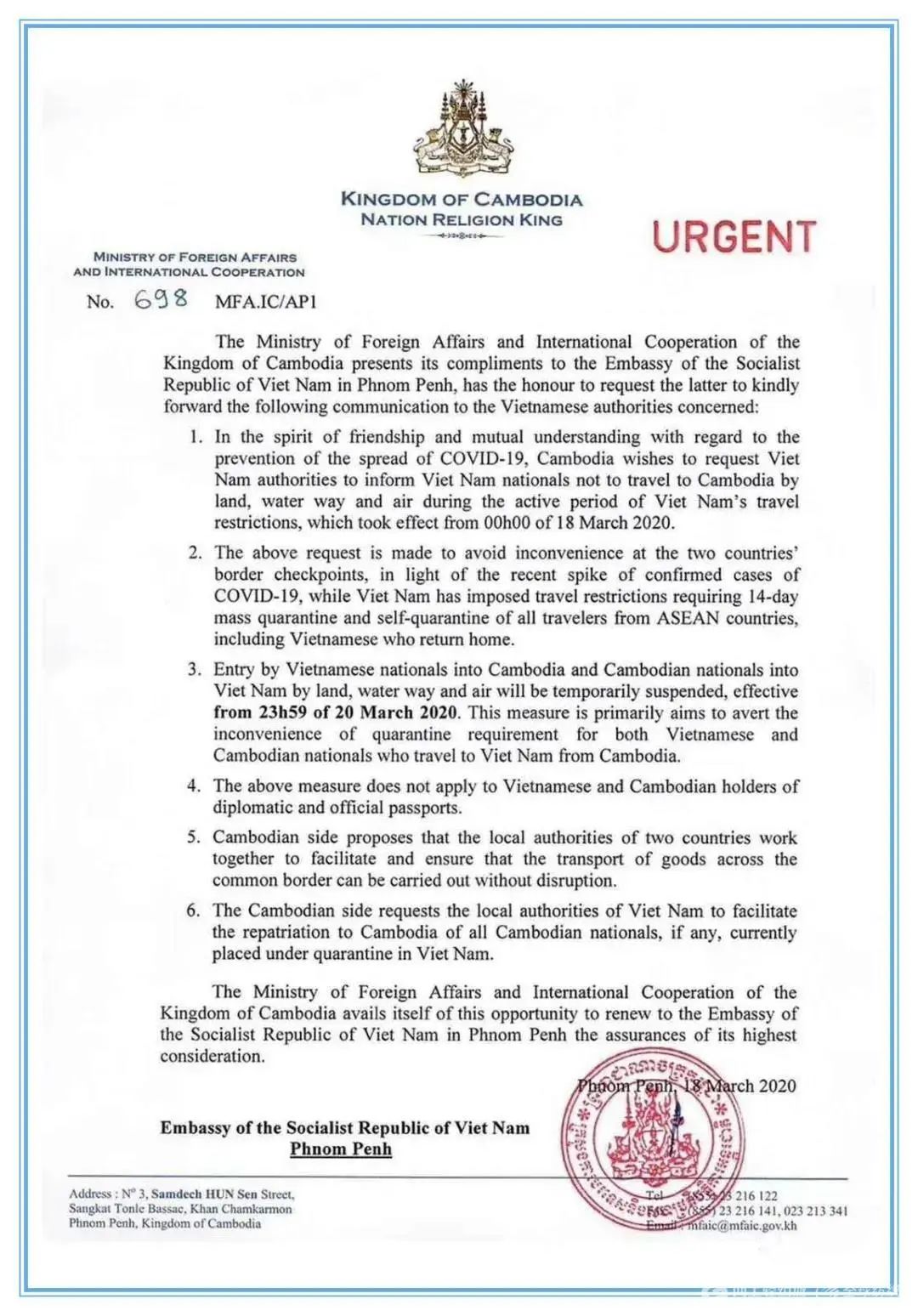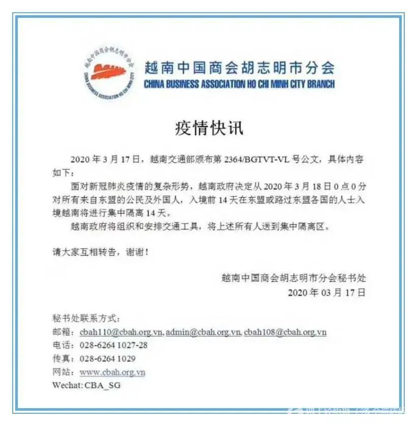 越南海關關閉柬越兩國邊境,司機需要隔離14天才可以回去越南,現在所有柜子都要走西港,不過壞消息是已有貨代表示西港也開始塞港了。另外,面對疫情的復雜形勢,越南政府決定從2020年3月18日0時起對所有來自東盟的公民及外國人,入境前14天在東盟或路過東盟各國的人士入境越南將進行集中隔離14天。