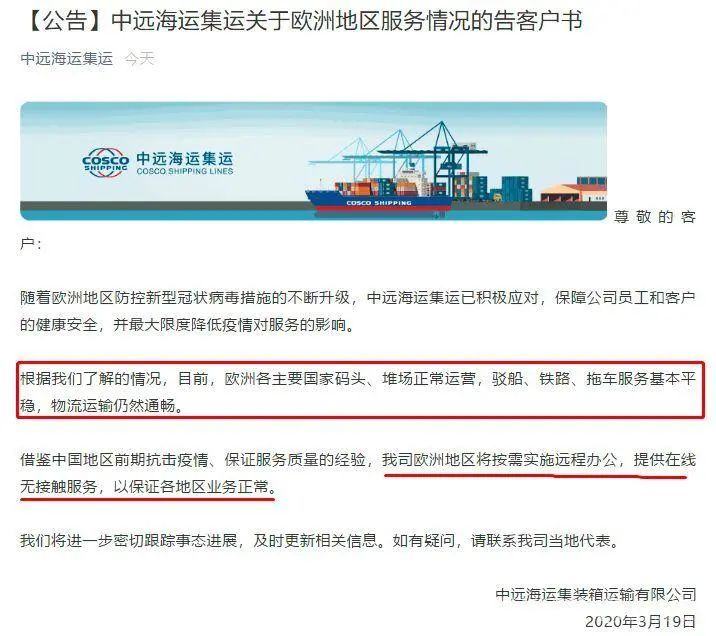 意大利、丹麥、法國港口正常運轉! 陸運開始擁堵 根據3月18日消息,歐盟成員國領導人,已同意暫時封閉歐盟邊境,為期30天。此外,為防止疫情擴散,歐洲多國于近日宣布加緊邊境管理,或在全國范圍內實施“封城”,這也意味著這些國家將“封國”。 多個歐洲國家都強調,國際貨運活動將繼續進行。中遠海發布公告: