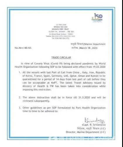 據了解,Barbours Cut是美國墨西哥灣的主要集裝箱裝卸碼頭之一,擁有6個泊位。目前正在對碼頭進行部分改造,計劃完成后港口裝卸能力有望從120萬TEU上升至200萬TEU。Bayport則擁有7個泊位,被認為是美國墨西哥灣沿岸最現代,最環保的集裝箱碼頭。 美國港口當局協會(AAPA)已警告稱,由于COVID-19,未來幾個月歐洲來港的貨物可能下降。“供應鏈中斷是另一個問題。AAPA總裁兼首席執行官克里斯·康納(Chris Connor)表示,這種類型的危機對整個經濟的影響很容易達到數百億美元。他說:“由于冠狀病毒的爆發,2020年第一季度美國許多港口的貨運量可能比2019年下降20%或更多。” 印度加爾各答港(Kolkata port)相關部門發布最新防疫指示,所有上一站?扛蹫橹袊、意大利、伊朗、韓國、法國、西班牙、德國、阿聯酋、卡塔爾、阿曼和科威特的船只,必須接受為期14天的隔離檢疫(從離開最后靠泊港開始計算)后,才可以?考訝柛鞔鸶圻M行作業。這一指示措施有效期至2020年3月31日,并在隨后進行審核考量。