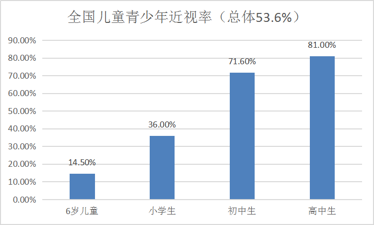 國家衛健委公布的《2018年中國兒童青少年近視調查結果》顯示,2018年全國兒童青少年總體近視率為53.6%。其中,6歲兒童為14.5%,小學生為36.0%,初中生為71.6%,高中生為81.0%。