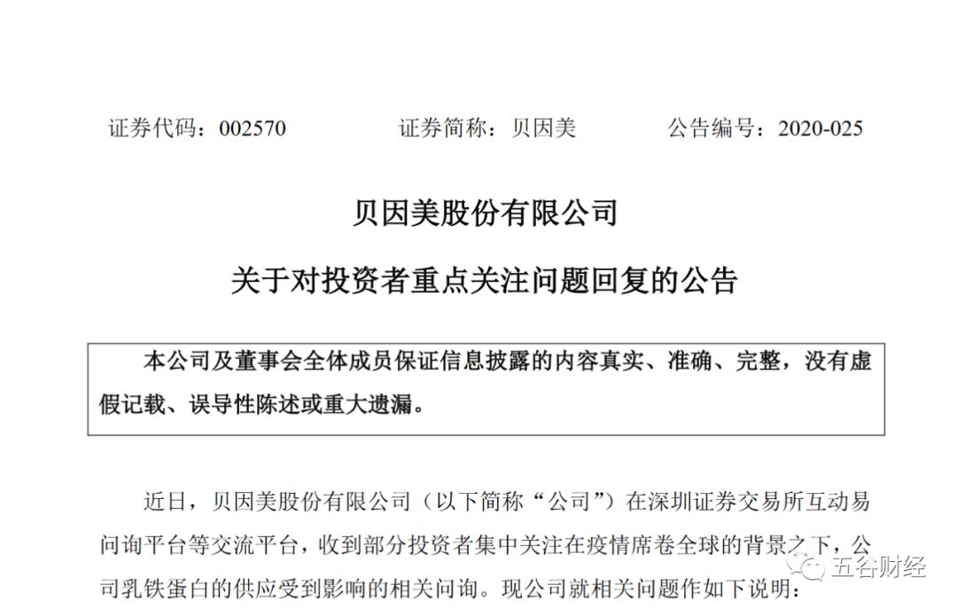 日前,貝因美在深交所互動易問詢平臺等交流平臺上,收到部分投資者集中關注在疫情席卷全球的背景之下,公司乳鐵蛋白的供應受到影響的相關問詢。