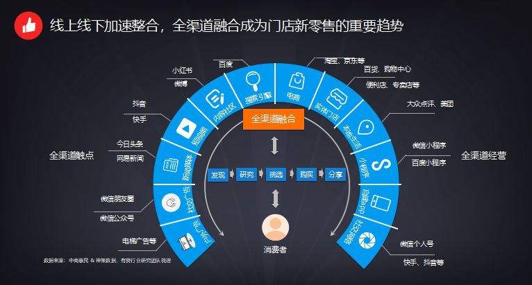 3、線上線下加速整合,全渠道融合成為門店新零售的重要趨勢。未來線上線下經營的是同樣一群人,賣的是同樣一批貨,只不過用了不同的營銷方式而已?吹竭@張圖的時候,不知道大家有沒有找到切入點,找到適合你自己的那個是最重要的。