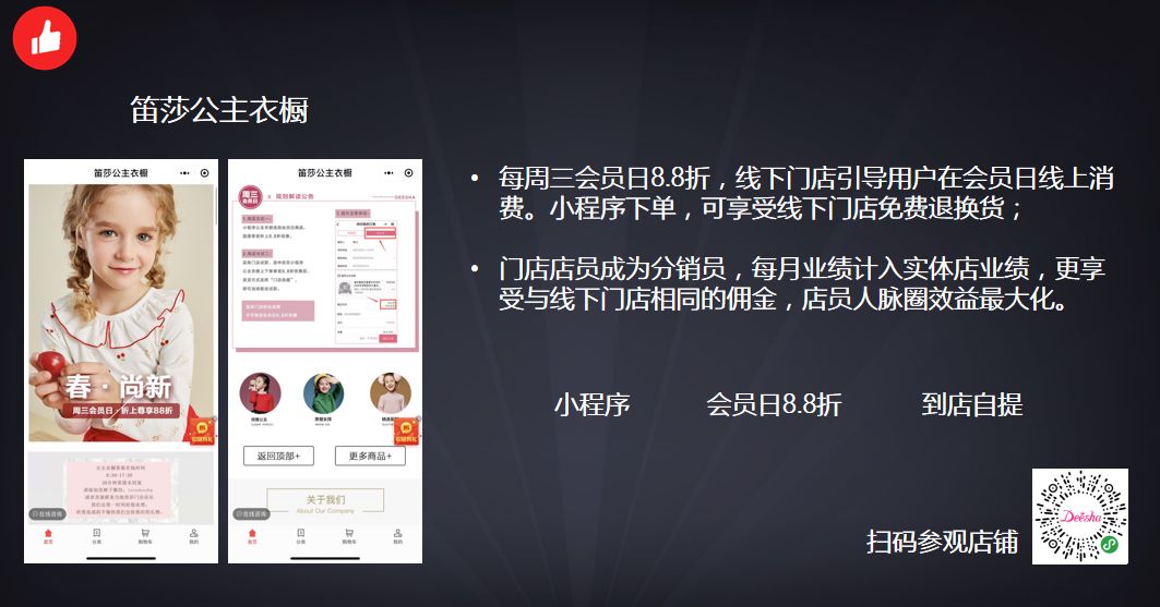 目前有贊在整個的母嬰行業交易過程當中扮演著工具的角色,你有自己的客戶,但是你缺乏的是營銷的工具系統以及能夠線上線下跟你的會員打通、跟商品打通、庫存打通等,有贊就是很好的工具。 母嬰線下門店適合將社交新零售作為增長的渠道,到店的客戶讓他成為粉絲,讓他幫你去分銷,實現轉化,形成一個完整的交易的閉環。 最后分享幾個案例,米粒媽福利社做的是定期閃購,固定閃購時間,提前公號預告,提醒用戶關注;知識付費和實物商品同時出售,用戶直接在“我的訂單”統一入口查詢不同類型的訂單,方便快捷。爸媽營通過有贊分銷市場拓展更多品類,實現一站式購物體驗。 另外,對于小程序,一定要有門檻,不要讓會員免費領取,免費獲得這些東西沒有人珍惜的,一定要付出成本,然后一定要到店自提,因為母嬰消費者扮演著多種身份,多種場景、多種營銷活動都能夠盤活你自己的老會員。其中笛莎公主就是一個很好的案例。