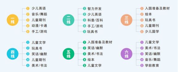 報告顯示,一二線市場仍是主力地區,低線市場是增長引擎。在地域成交額分布上,從2017到2019這三年的童書市場增速尤為明顯的是二線至五線市場。