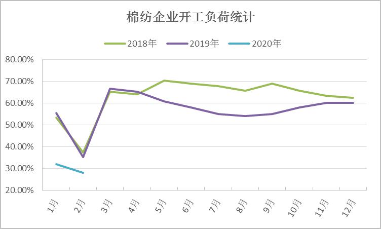 據統計,截止到2月底國內棉花商業庫存為614.3萬噸,環比下降2.5%,同比增加3.2%,處于近5年同期最高水平。由此可見,棉花市場供應寬松,短期供應端不支撐棉價上漲。 下游棉紡企業開工負荷同比大幅下降令棉花消費預期下滑