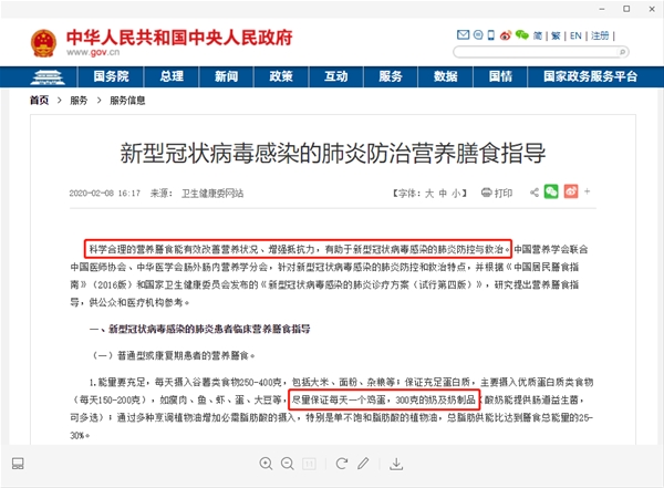 中華人民共和國中央人民政府網站、國家衛健委官網發布的《新型冠狀病毒感染的肺炎防治營養膳食指導》中明確指出,“科學合理的營養膳食能有效改善營養狀況、增強抵抗力,有助于新型冠狀病毒感染的肺炎防控與救治。”以及“盡量保證每天一個雞蛋,300克的奶及奶制品”,文件旨在通過科學合理的營養來提升人體的免疫狀況,增強對疾病的抵御能力。