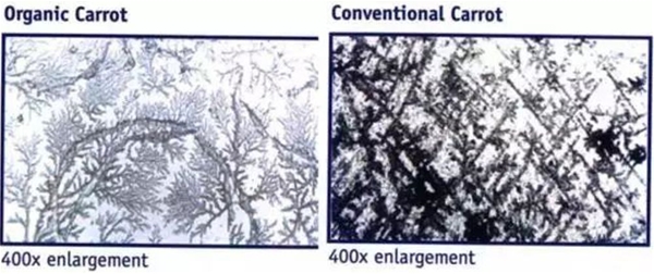 左邊是有機馬鈴薯結構排列有序,僅有一個中心。右邊是普通馬鈴薯,結構排列松散,卻有多個中心。 03 第三組有機VS非有機胡蘿卜細胞對比圖 左邊有機胡蘿卜的結構清晰有規律,而非有機胡蘿卜的結構凌亂粗糙。