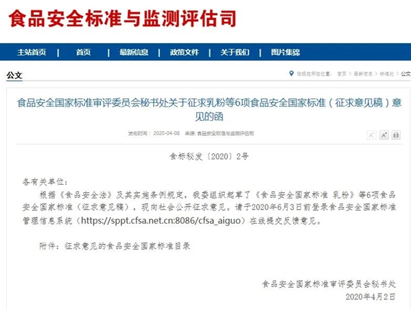 近日,根據《食品安全法》及其實施條例規定,國家衛健委組織起草了《食品安全國家標準乳粉》等6項食品安全國家標準(征求意見稿),已面向社會公開征求意見。