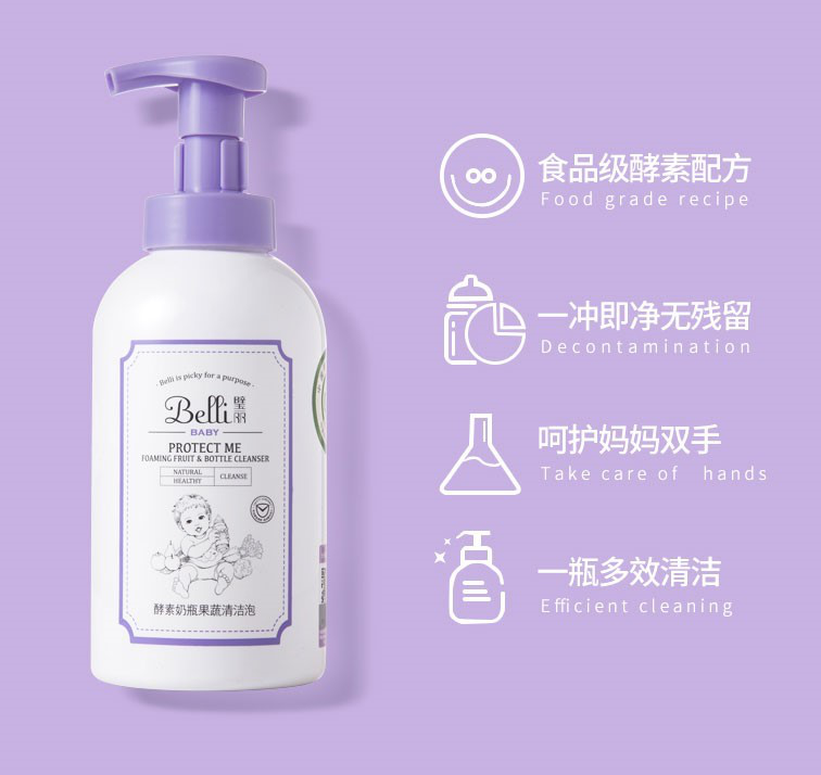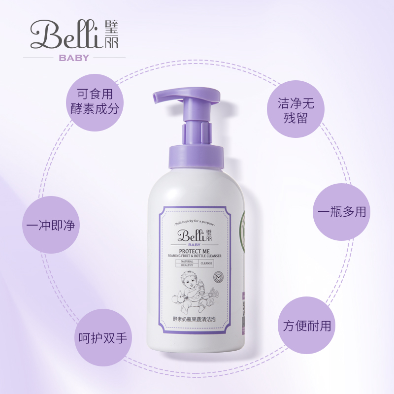 食品級酵素配方,入口級安全 Belli嬰兒奶瓶果蔬清潔泡,來自美國以嚴苛安全成分篩選著稱的Belli品牌,所以在成分的選擇與配比上,更嚴格,更具針對性,因此安全性也更高。經權威檢測機構檢測認證,貼心守護寶寶的入口健康。 Belli嬰兒奶瓶果蔬清潔泡是一款專為寶寶設計的入口物清洗劑,食品級酵素配方,富含脂肪酶、蛋白酶等多種酶,能分解奶漬、唾液、汗液中的蛋白質,有效去除奶瓶璧、奶嘴及各種死角里的油脂和奶垢,用它清洗過后奶瓶煥然如新。