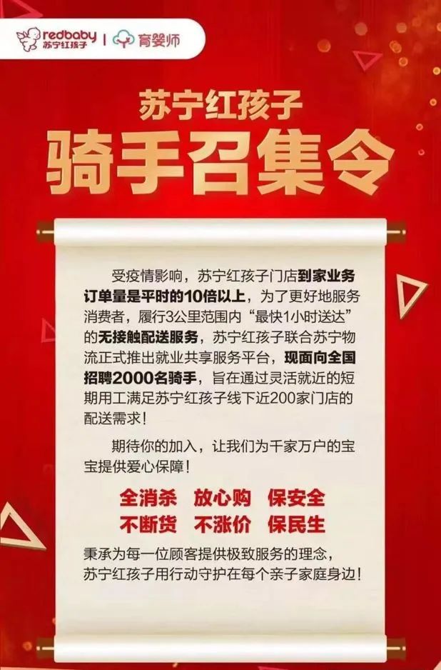 蘇寧紅孩子從2月6日開通共享就業報名通道,2月中下旬已有超過1000個騎手報名參與,通過線下近200家門店向消費者提供3公里范圍內“最快1小時達”配送。同時,還采取了“配送雙保險”:為了確保騎手的健康狀況,蘇寧紅孩子會定時監測騎手的體溫,一律要求佩戴口罩;為保證交付安全,工作人員在配送過程中,會首先電話聯系用戶確認收貨的方式,將包裹放置指定儲物柜,并通知用戶自行提取快遞,全程與客戶零接觸。