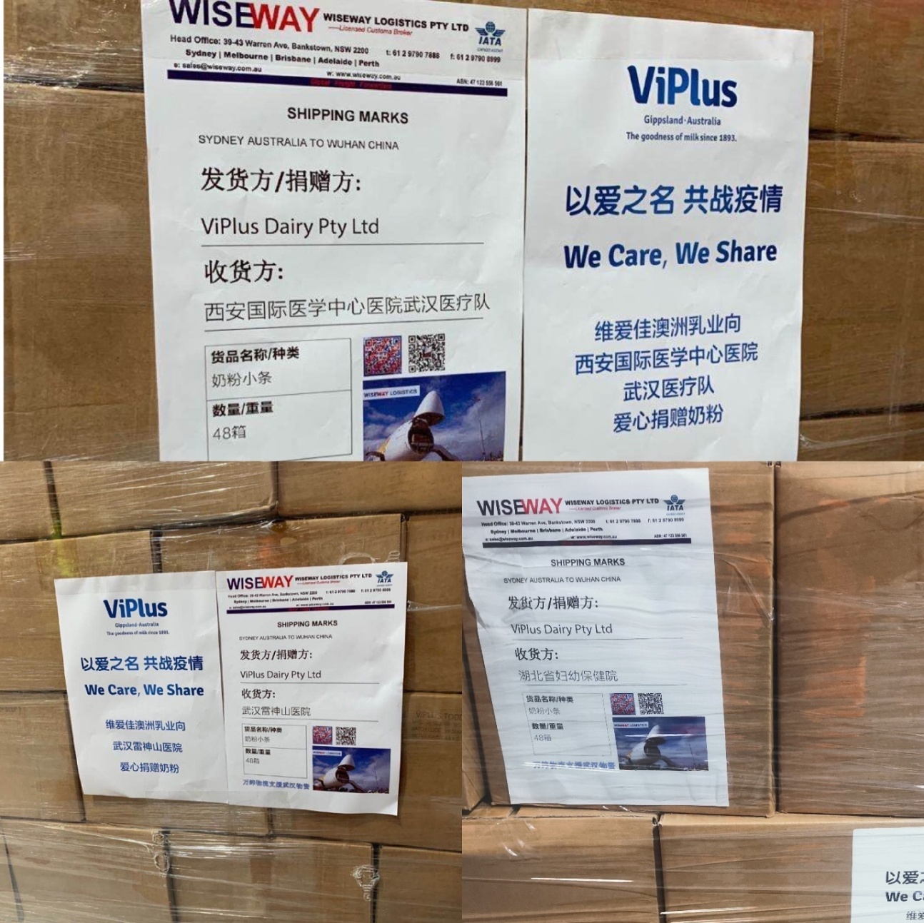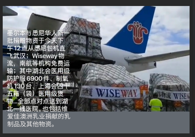 2月16日萬緯物流吹響集結號角; 2月17日-19日澳大利亞各企業、組織、團體等迅速響應; 2月19日維愛佳澳洲乳業就將價值200萬元的營養配方奶粉和口罩等防疫物資送達萬緯倉庫。此時,分散在澳大利亞各城市的倉庫成為武漢堅強的大后方,成為儲備糧草的大本營。 2月24日,中國南方航空公司的包機將滿載著來自澳大利亞的關切,直達病毒風暴中心。